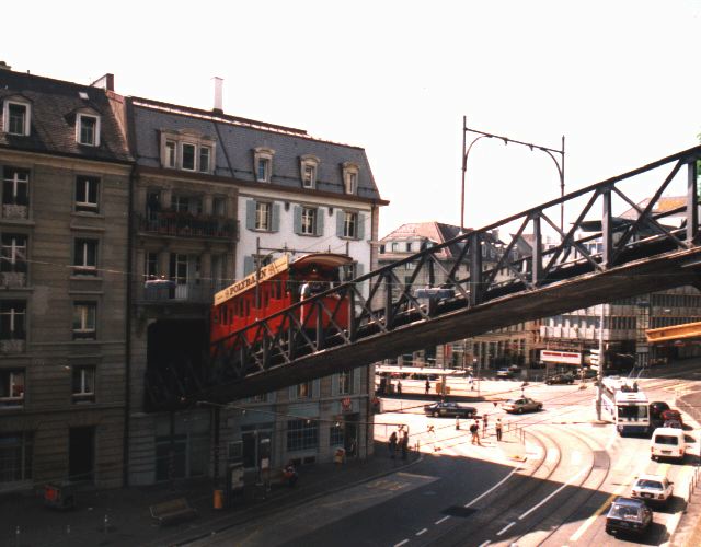 The Polybahn emerges from the Limmatquai building which is it's lower station and crosses Seilergraben and Hirschengraben on a steep bridge. The trolleybus of route 31 which can be seen in the background has just passed under this bridge.