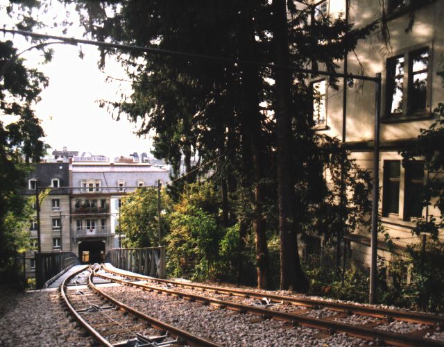 It is now early October, and the new Polybahn is almost complete. Here is the lower end of the passing loop on the Hirschengraben/Seilergraben bridge. The reduction from the three to the two rail system and the absence of racks makes the layout appear much simpler. Note also the empty space vacated on the left side of the bridge beyond the loop by the new cars sharing tracks.