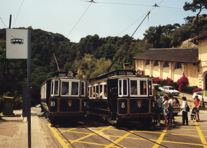 Two trams meet on Barcelona's Tibidabo tramaway. This route, which uses heritage cars, connects Tibidabo FCG station to the Tibidabo funicular. The funicular station can be seen on the right of the picture.