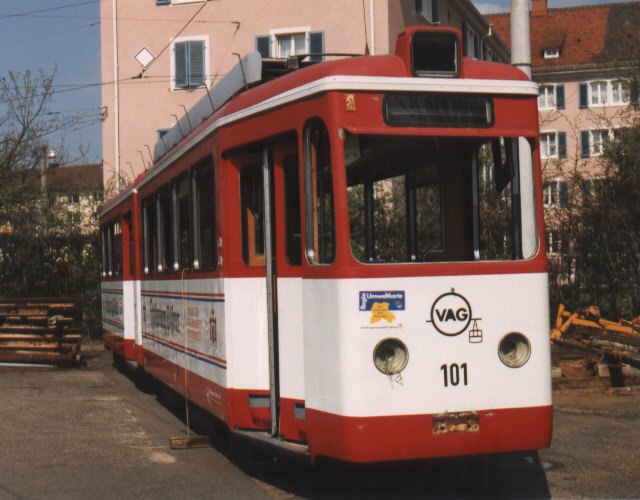 It was end of the road for Sputnik 101 in this April 1995 view of the vehicle being scrapped at Komturstr. depot. The front part is basically a 4 wheeled Verbandstyp car and the rear part is supported on this and on a bogie. Besides being Freiburg's first articulated tramcars, these 3 units built by Rastatt in 1959 introduced other new features to Freiburg such as automatic doors. 101 was the first of this type to be scrapped. 102 (which was once earmarked for preservation, and hence allowed to keep it's beige and green livery and single headlamp) followed suite. 100 still sees sporadic use as an advertising vehicle.