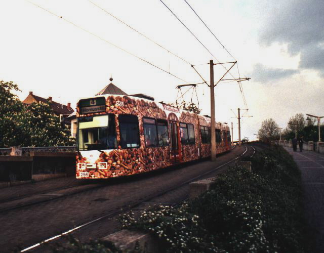 GT8 256 on the Stadtbahnbrücke viaduct on 31.04.00. This car, painted with buns and breads is one of the most attractive of the advertising liveries. It advertises the Usländer Bakery.