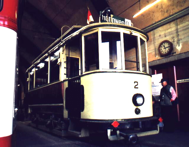 Freiburg's oldest surviving tramcar, and last of the original fleet, stands at Komturstr. depot on 07.05.00. The car dates from 1901. The balconies were glazed later.