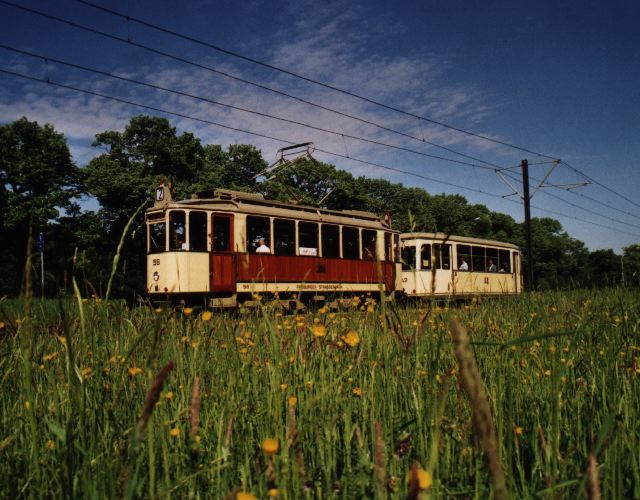Preserved set 56 with trailer 142 pose for a photo on the Günterstal route on 07.05.00. This was the first time in about 30 years that a trailer had been used on the Günterstal line.