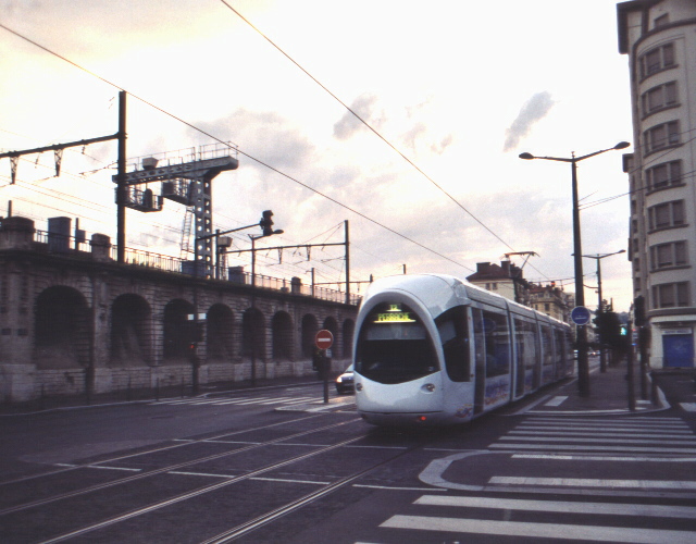A tram on T2 leaves Jean Mace tram stop on 03.09.01. In the background is the railway to Perrache station.