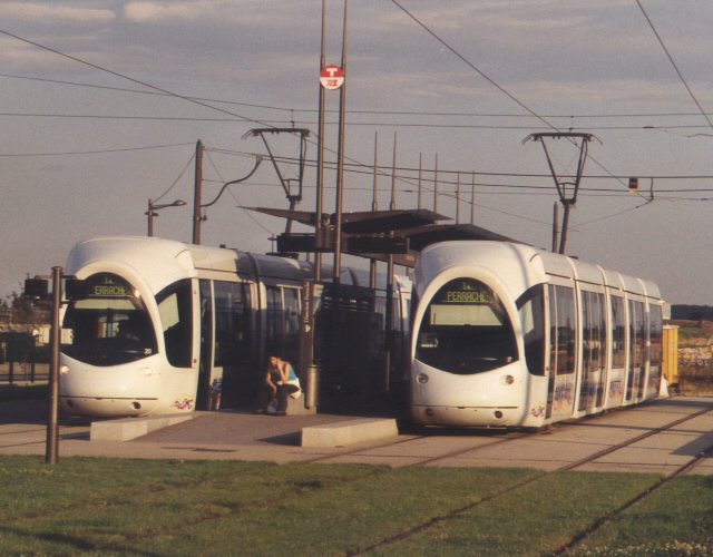 Lyon trams at Porte des Alpes terminus on 03.09.01.