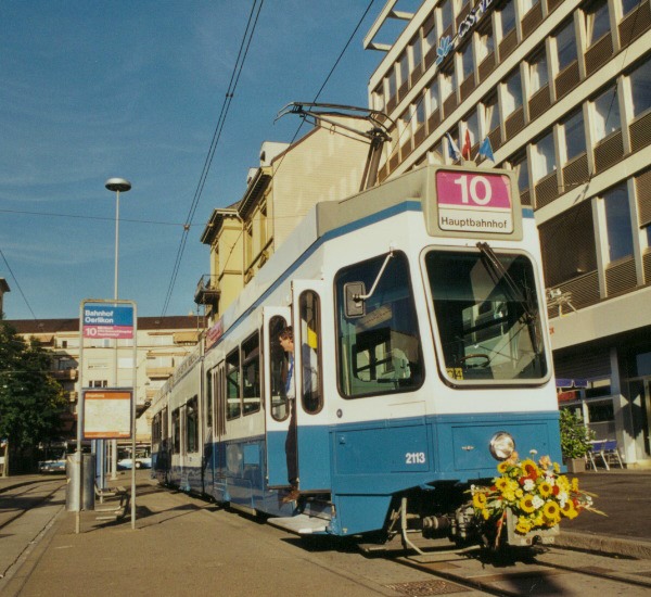 25th October 2001. Tram 2000 car 2113 has been fitted with a low floor section. The section was built in the VBZ's own workshops using mainly Tram 2000 parts. Here the lengthened car stands at Oerlikon station on it's first day in service. 2113 ran on route 10 on this and the following day before being transferred to route 6.